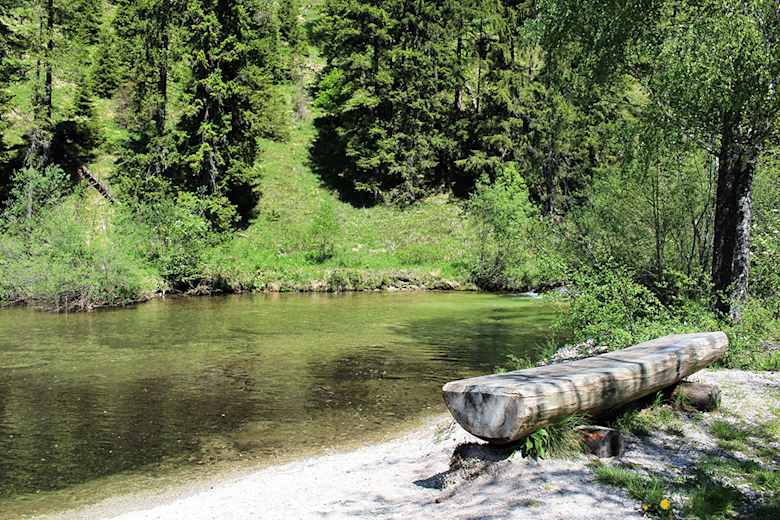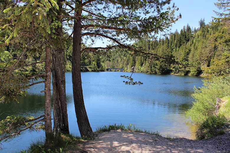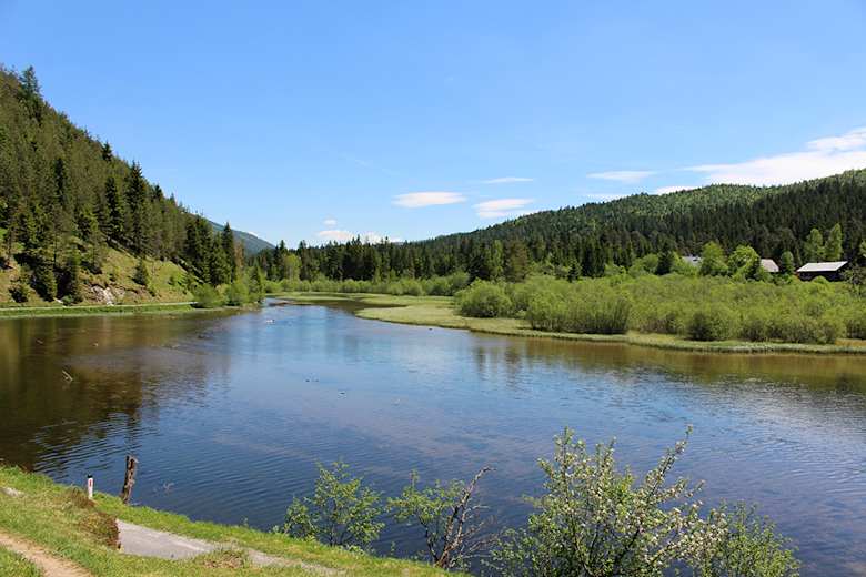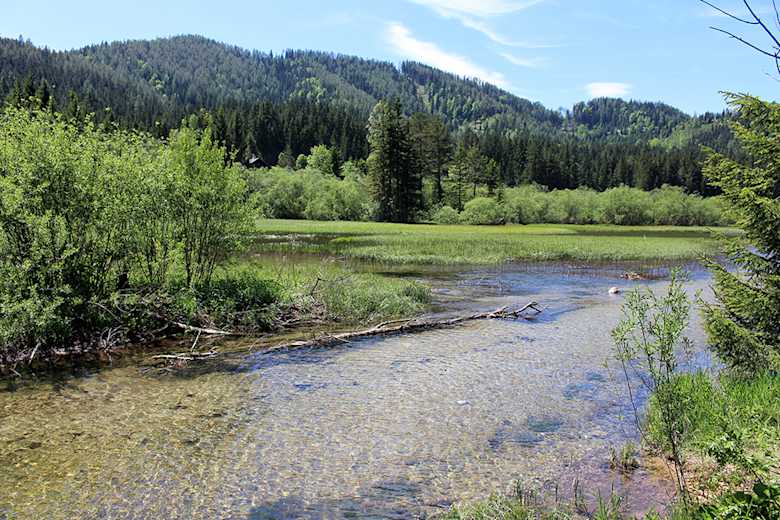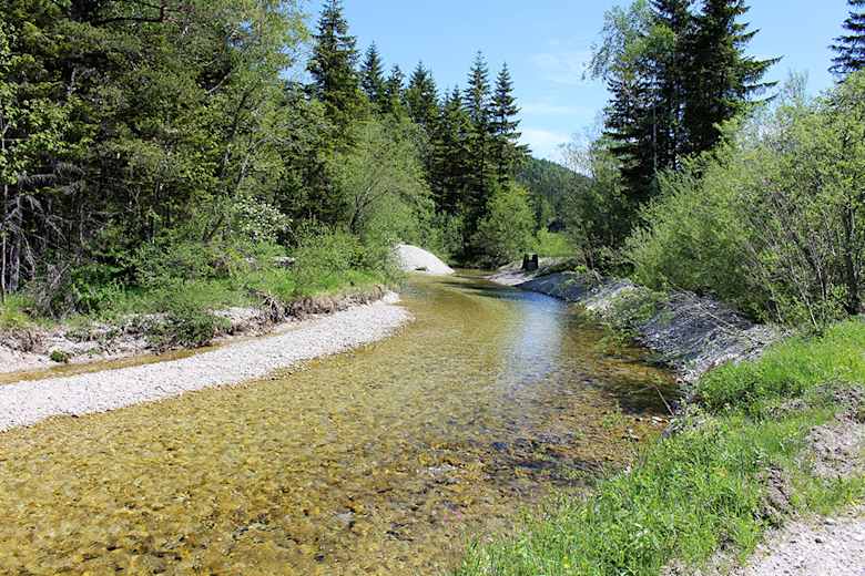Die Wanderung beginnt bei der Wuchtlwirtin (Großer Parkplatz). Von dort geht man ca. 350 Meter auf der asphaltierten Straße zum See (Richtung Südwesten). Kurz nach einer Bank am Straßenrand biegt man rechts auf den befestigten Forstweg ab, der zur Weißen Walster hinunter führt. Gleich hinter einem ehemaligen Forstgebäude gelangt man zu einem Marterl mit Rastbank am Fluss. Links vom Weg erstreckt sich hier eine geschützte Feuchtwiese. Zweihundert Meter weiter trifft man bei einer Schotterentnahmestelle schon auf die nächste Bank (diesmal ohne Rückenlehne). Nach weiteren 300 Metern auf demselben Weg erreicht man kurz nach einer kleinen Brücke das Seeufer, wo ebenfalls ein Rastplatz auf die Wanderer wartet. Ein kurzes Stück links von der Wegkreuzung in Richtung Walster Straße befindet sich ein kleiner Parkplatz (nicht asphaltiert).
