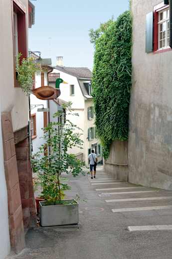 Durch schmale Gassen und über einige Stiegen erreicht man das Tal. Ohne es zu merken, überquert man in der Falknerstrasse den Birsig, der seit gut hundert Jahren zwischen Heuwaage und Schifflände unterirdisch zum Rhein fliesst.