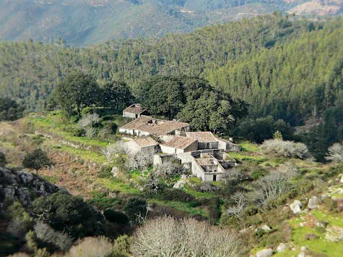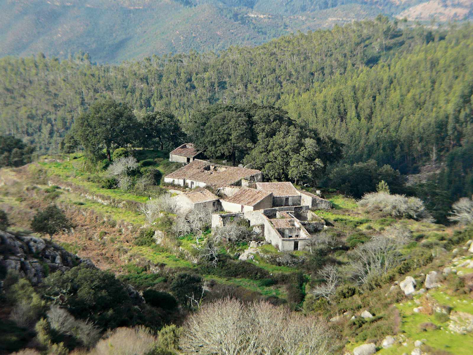 Man geht ein kurzes Stück zurück und folgt an der Gabelung dem linken Weg in Kehren hinab bis zur Straße, der man links bergauf folgt. Verlassene Almsiedlungen liegen am Weg, manche werden noch als Ställe genutzt. Ein gutes Stück oberhalb des Weges liegt der Gipfel der Fóia, den man in einer großen Rechtskurve umgeht. Bei einer Wegkreuzung trifft man auf die Via Algarviana, auf der man nun ein Stück weiterwandert.