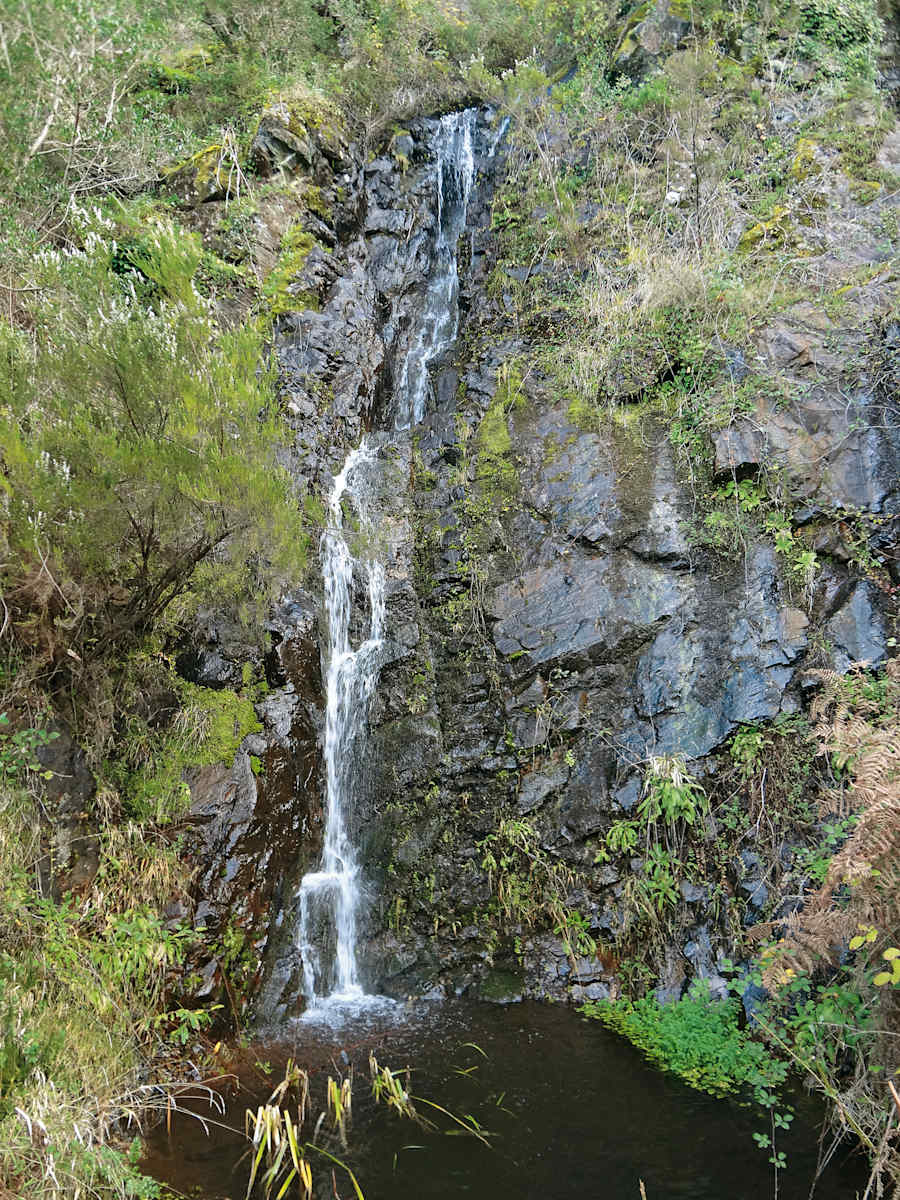 Wenig später biegt der Weg neuerlich nach rechts ab und trifft auf eine Asphaltstraße, der man nach rechts durch die Streusiedlung Souto folgt. Die Straße mündet alsbald in eine breitere Asphaltstraße, der man in einer großen Kurve nach links folgt. Hier hat man nun einen guten Blick auf die Fóia. Wenig später erreicht man den ersten Wasserfall, die Cascalho dos Frades. Nachdem man diese Kaskade passiert hat, verläuft die Asphaltstraße in einer großen Linkskurve leicht bergan. Wenig später zweigt der Weg steil nach rechts auf eine schottrige Piste ab. Man wandert weiterhin bergan. Rechter Hand des Weges liegt ein Gebäude, das als Stall einer Almwirtschaft dient.