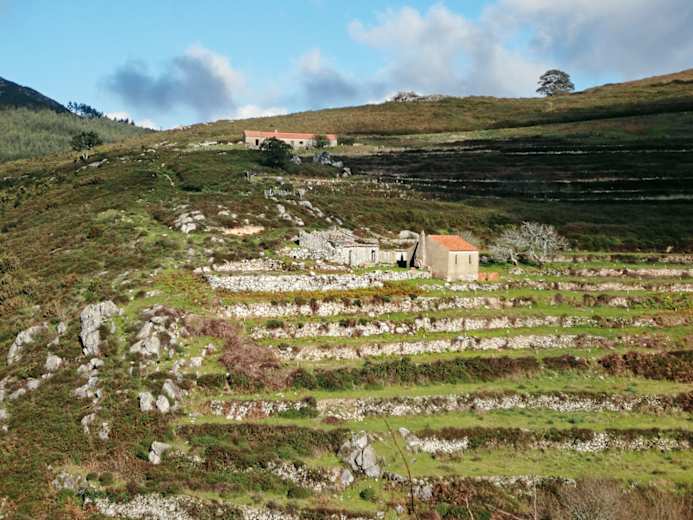 Danach führt der Weg nur noch gemächlich bergan. Bald kommt man zu einem weiteren verlassenen Almhaus. An dieser Stelle wird der Weg breiter; man folgt ihm ein kurzes Stück nach rechts. Wenig später zweigt man auf den markierten Weg nach links ab und wandert durch einen lichten Wald (zumeist Eukalyptus). Dieser Wegabschnitt führt wunderschön leicht bergan durch Wälder, die von Lichtungen unterbrochen sind. Bei der folgenden Weggabelung wählt man den geradeaus verlaufenden (markierten) Weg, der durch einen dichten Eukalyptuswald leicht bergab führt. Nachdem man den Wald verlassen hat, sieht man den Höhenrücken des Cimalhadas (792 m) vor sich.