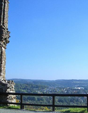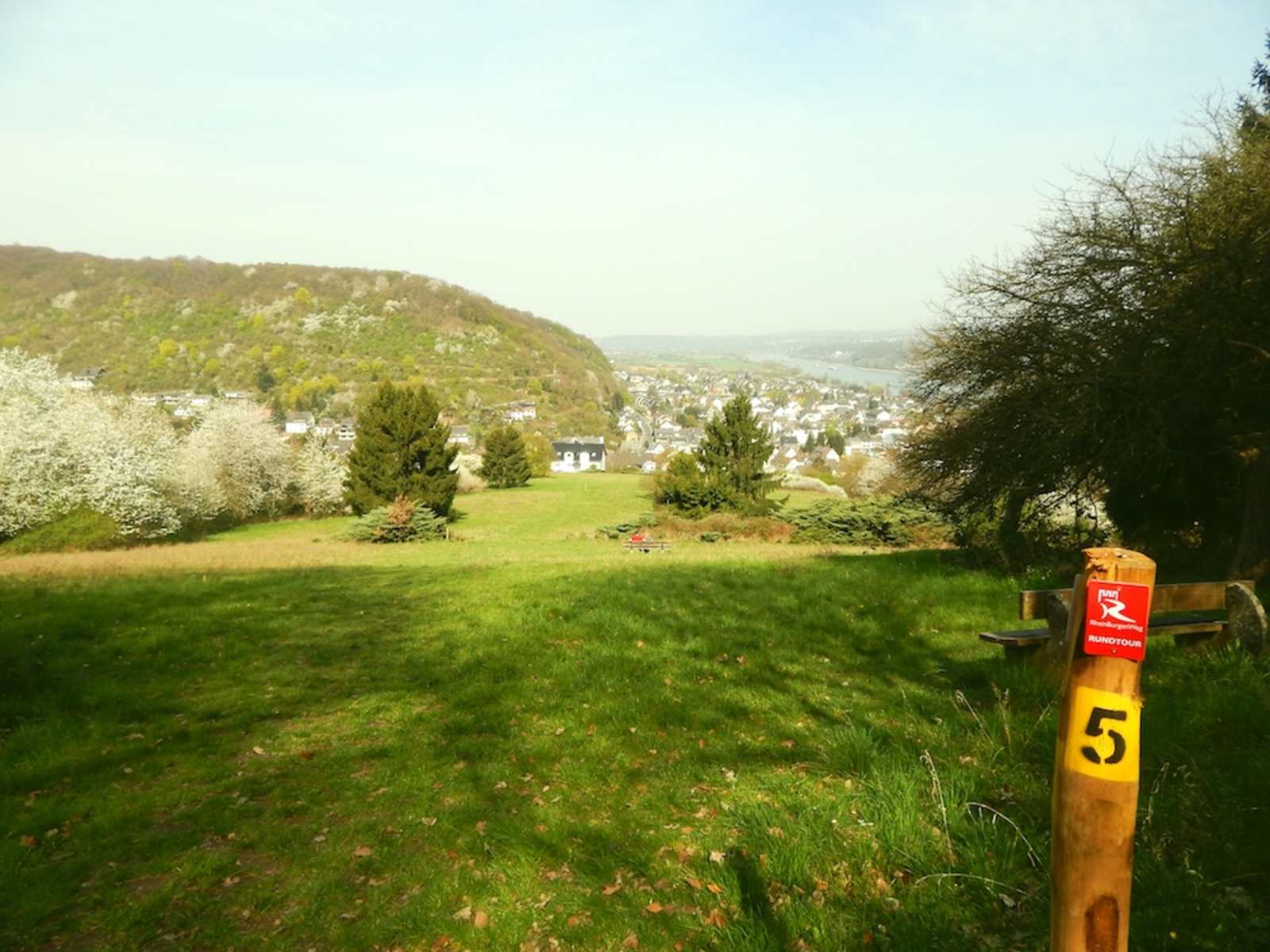 Der Weg bringt die Wanderer anschließend hinunter in Richtung Gönnersdorf. Dabei erblickt man am Horizont die Burg Olbrück. Man wandert nun weiter durch Wiesen und kurze Waldstücke in Richtung Waldorf. Vor dem Ort biegt man nach rechts ab in Richtung Wallers. Man spaziert durch die schöne Landschaft zu einem kleinen Drehtor. Durch dieses kommt man zu einem kleinen Wildgehege. Hier kann man Rehe beobachten. Man geht hinunter in das Heiligental und wandert weiter nach Mönchsheide. Hier befindet sich ein Segelflughafen. Man durchwandert eine keltische Siedlung und genießt fantastische Blicke auf das Rheintal und die Burgen Arenfels und Rheineck. Zum Abschluss wandert man nach Bad Breisig hinunter.