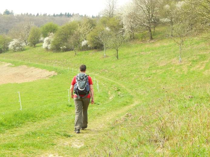 Vom Parkplatz spaziert man an den Römer-Thermen vorbei in Richtung Bahnhof. Nach den Tennisplätzen taucht der Weg nach rechts in den Wald ein. Der Weg führt hinauf zur Fichtelhütte, von der man eine wunderbare Aussicht genießt. Anschließend wandert man durch den Friedwald weiter bergauf. Vor dem Wanderer liegt das Plateau der Lieshöhe. Dabei handelt es sich um eine fruchtbare Landschaft, die während der Eiszeiten entstand. Der Rhein floss einst hier oben, wie man an vielen gerundeten Steinen erkennen kann. Es geht weiter über das Plateau, und man überquert zahlreiche wildromantische Streuobstwiesen.