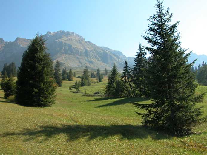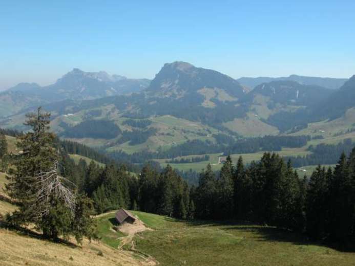 Immer weiter ansteigend wird schließlich Äschi erreicht (1.230 m). In wiederholtem Auf und Ab geht es nun über Salzbüel, Baumgarte, Unterbargele und Finishütte nach Längegg und weiter hinauf nach Doppelschwanderhowald.
