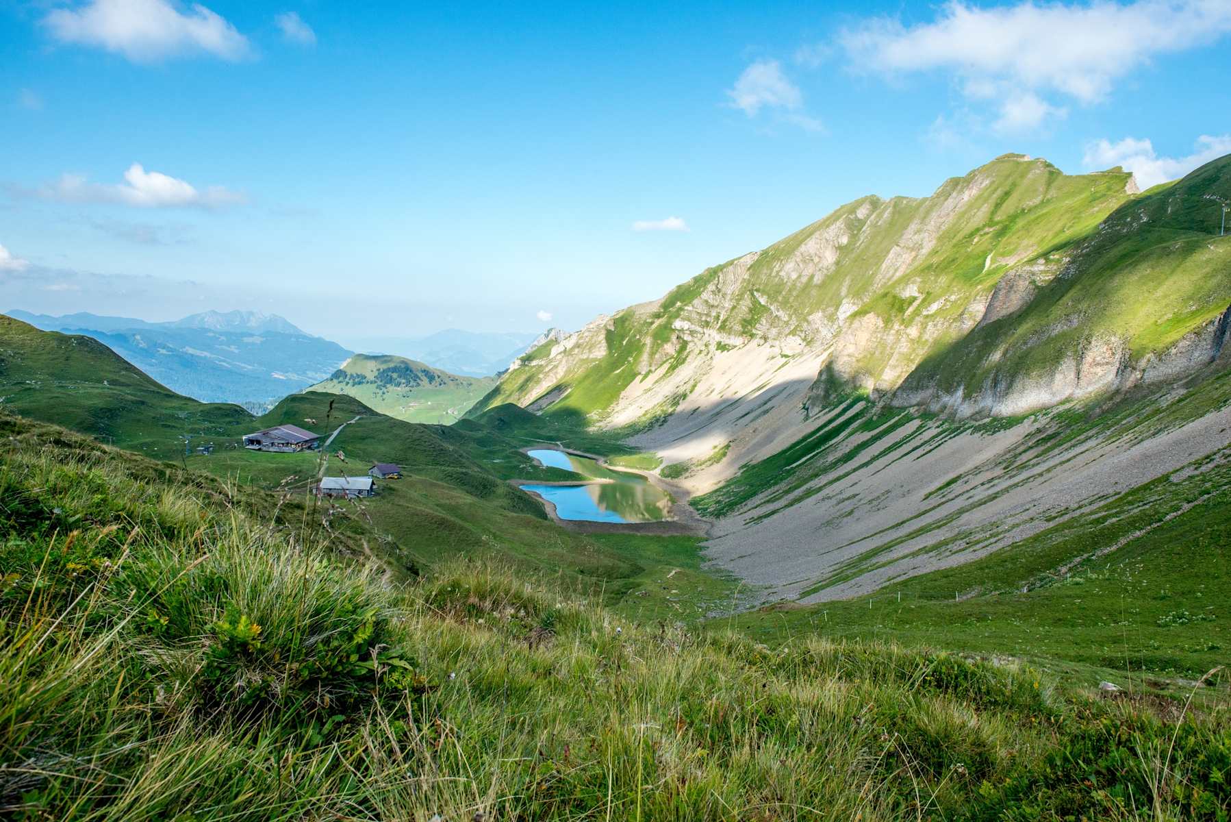 Nach einem ausgiebigen Frühstück Berghaus Eisee (1.900 m) folgt man der Beschilderung auf den Eiseesattel (2.024 m), wo man zuschauen kann, wie die Frischmilch von der Alp über die Köpfe hinab zur Käserei schwebt. In den steilen Geröllhalden zur Linken halten sich oft Wildtiere auf und bieten am Aufstieg zum Arnihaaggen (2.216 m) eine interessante Geräuschkulisse.