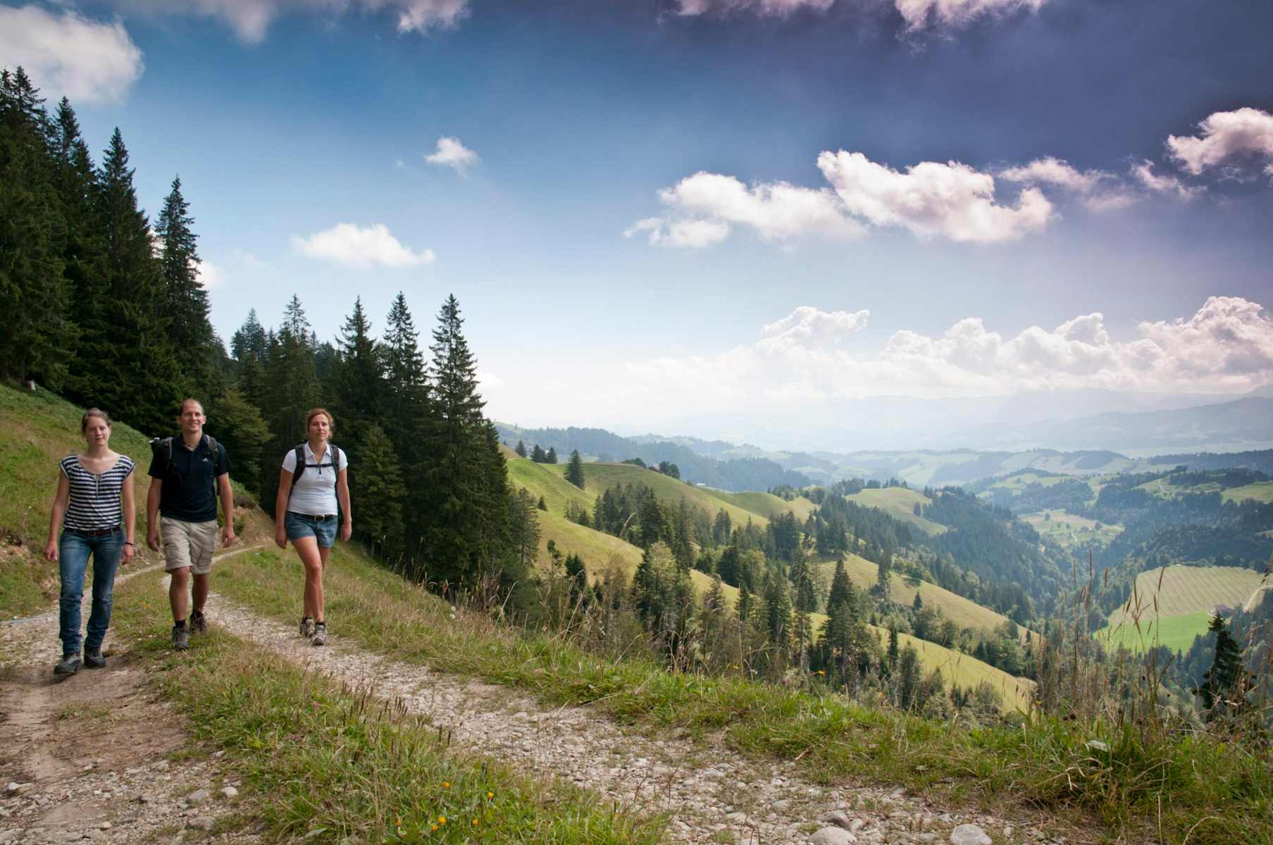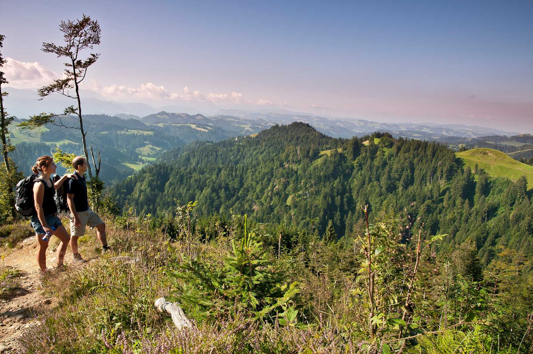 Kurze Aufstiege wechseln immer wieder mit längeren flachen Abschnitten, die fabelhafte Ausblicke in die vielfältig strukturierte Landschaft des Napfgebiets gewähren: Von tiefen Gräben über bewaldete Steilhänge und schmale Eggen.