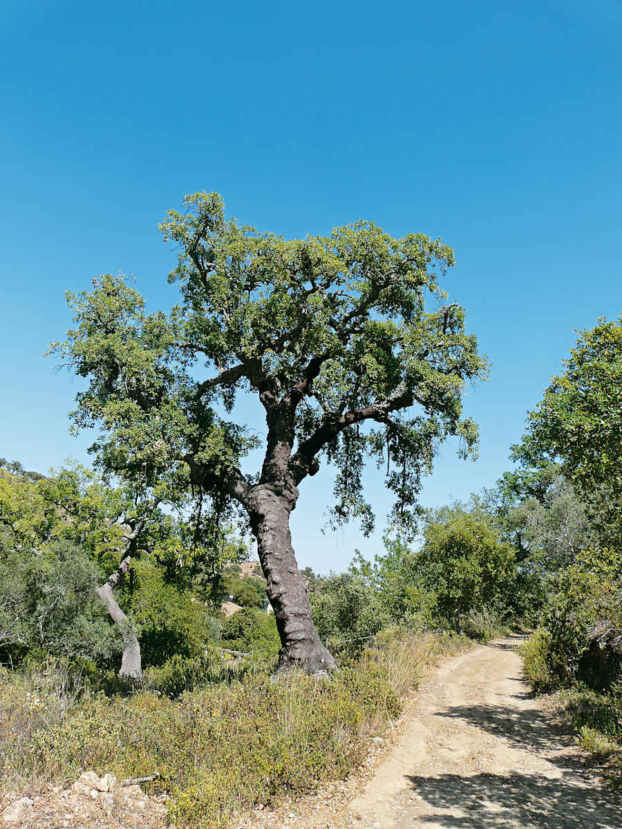 Anschließend folgt man wieder der Asphaltstraße weiterhin leicht bergan. In einer großen Kehre nach rechts kurz vor der N 270 zweigt man nach links auf einen schönen Pfad ab. Dieser verläuft parallel zur Straße und führt bergab in Richtung Flussniederung. Stein- und Korkeichen spenden entlang des Weges Schatten. Der Weg mündet in eine Asphaltstraße, der man entlang des Flusstals folgt. Man kommt an einem Glashaus links des Weges vorbei und wenig später an einem schönen Brunnen.