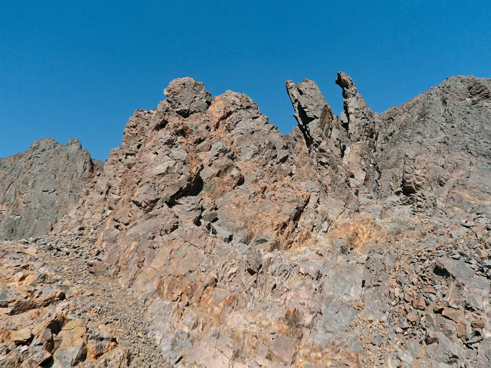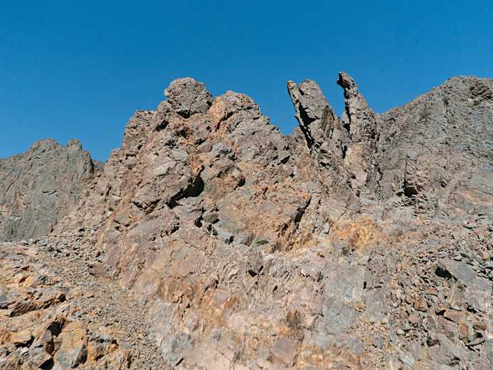 Der längst sichtbare Pass Tizi n’Ouagane ist in einem steilen letzten Aufschwung nach etwa 2 h erreicht. Vom Gipfelziel ist weiterhin nichts zu sehen, die steilen Felsen des Ostgrats auf der rechten Seite ziehen jetzt die Aufmerksamkeit auf sich. Der Grat ist als solcher kaum erkennbar, scheinbar ohne jegliche Struktur verlaufen Felsrippen, Grattürme und Blöcke Richtung Westen. Zwei auffällige, etwa 7 m hohe Felsnadeln sind der erste Orientierungspunkt. Ohne Probleme lassen sich die bizarren Gebilde rechts umgehen.