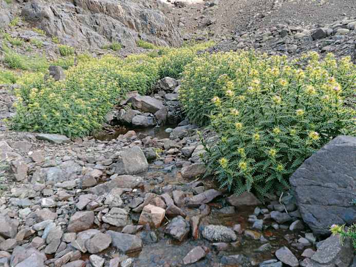 Dort geht man zunächst weiter talein, am Rand des breiten Talbodens, um nach gut 200 m den mit Kieseln und Steinen übersäten Flussboden auf deutlicher Spur zu queren. Das Tal verjüngt sich nun abrupt und die Wanderroute wendet sich der östlichen Talflanke zu, um dort nach dem langen flachen Abschnitt an Höhe zu gewinnen.