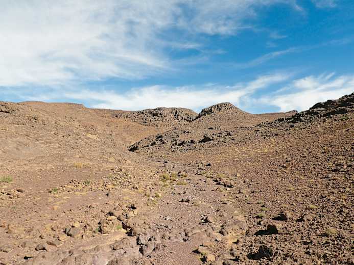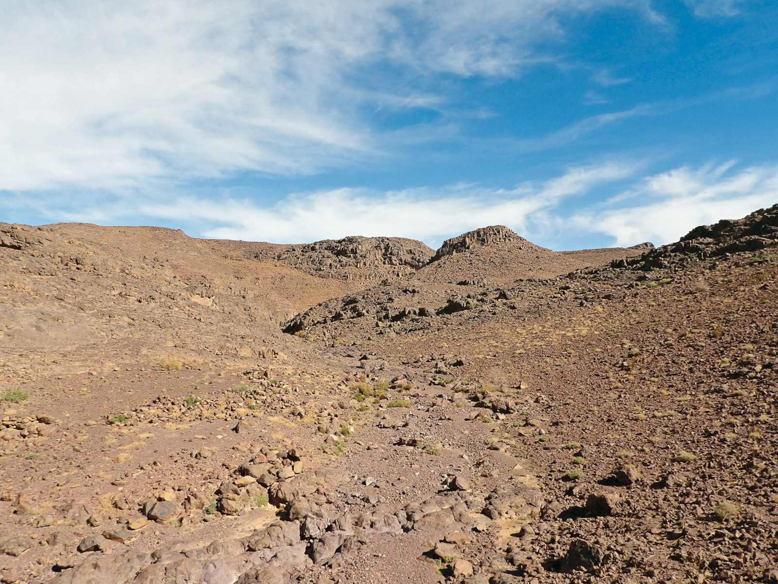 Nach gut 30 min (seit Verlassen des breiten Weges) nimmt die Steigung zu; man verlässt den Oued dort nach links, wo das Gelände eine Route anbietet, um die quer laufende Erhöhung problemlos zu überschreiten. Etwa 700 m weiter kann in einem Rechtsbogen wieder die südöstliche Grundrichtung eingeschlagen werden. Die nächste Barriere in Form eines quer laufenden Höhenzugs tritt in das Blickfeld. Eine günstige Stelle zur Überwindung des Hindernisses befindet sich nahe dem südlichen (rechten) Ende, nicht weit vom Kamm über dem Oasental. Nach etwa 2 h überschreitet man den Bergkamm.