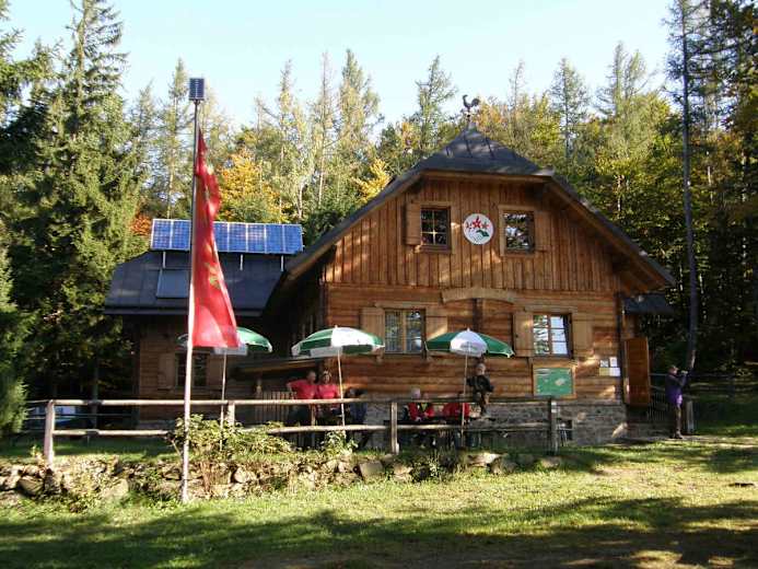 Ein Stück weit geht es nun deutlich aufwärts. An der Wegverzweigung hält man sich links. Wo man auf einen querlaufenden Weg trifft, hält man sich abermals links und folgt dem Wanderweg das letzte Stück durch Wald bis zur Gföhlberghütte auf 825 m.