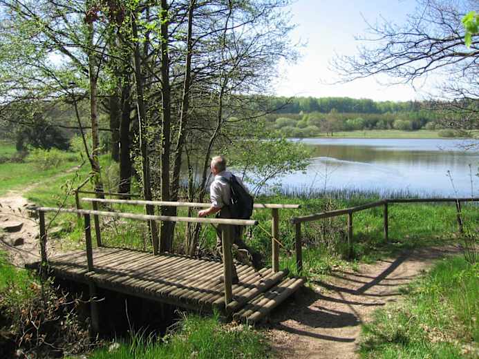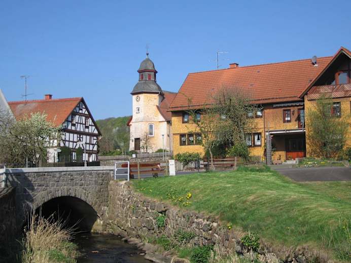 Vom Kolping Feriendorf wandert man entlang von alten Grenzsteinen bis zum Ende des Waldes. Hier genießt man einen tollen Blick auf Herbstein. Der Weg biegt nach links ab und führt zu den Schalksbachteichen, der Brutstätte für seltene Wasservögel. Man wandert durch den "Heiligenwald" und weiter durch die weite Fläche des Seifengrundes. Durch eine schöne Wald- und Wiesenlandschaft geht man bis zum Diebstein (570 m), dem höchsten Punkt der Wanderung.