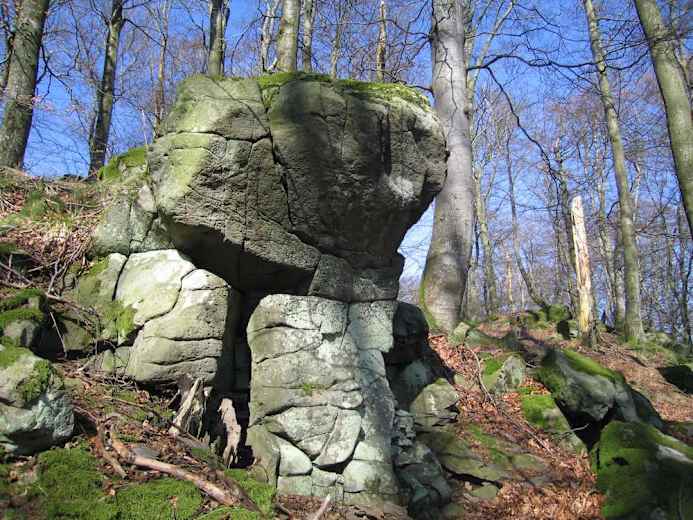 Von hier wandert man auf einem Feldweg durch Lanzenhein, einem schönen Vogelsbergdorf mit renovierten Fachwerkhäusern. Der Weg bringt den Wanderer zu einem mit Basaltblöcken durchsetztem Buchenmischwald. Man erreicht den Burgfrieden, eine mächtige Basaltformation, mitten in einem Gewirr von Basaltblöcken.