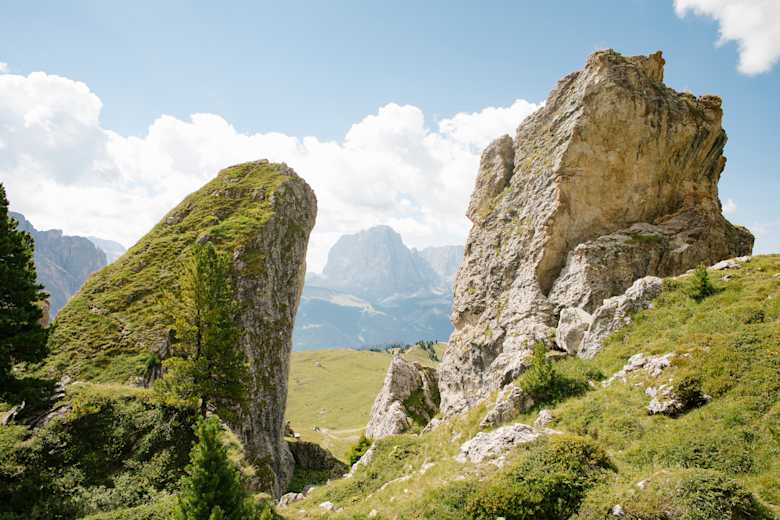 Hier steigt man bis zum Aussichtspunkt auf 2.518 m auf, von dem man einen tollen Blick auf die außergewöhnliche Form der Geislergruppe und ihren Fermedatürmen hat. Abseits des Weges wachsen unzählige Edelweiß, die unter Naturschutz stehen. An der Kuppe entlang geht es nun abwärts, über blumenbedeckte Wiesen, bis man zur kleinen Malga Pieralongia, die inmitten riesiger Felsbrocken liegt. Von hier wandert man auf breiten Wegen über die Almwiesen hinab, vorbei an der alten Regensburger Hütte, bis zum Ausgangspunkt an der Bergstation der Col-Raiser-Seilbahn.
