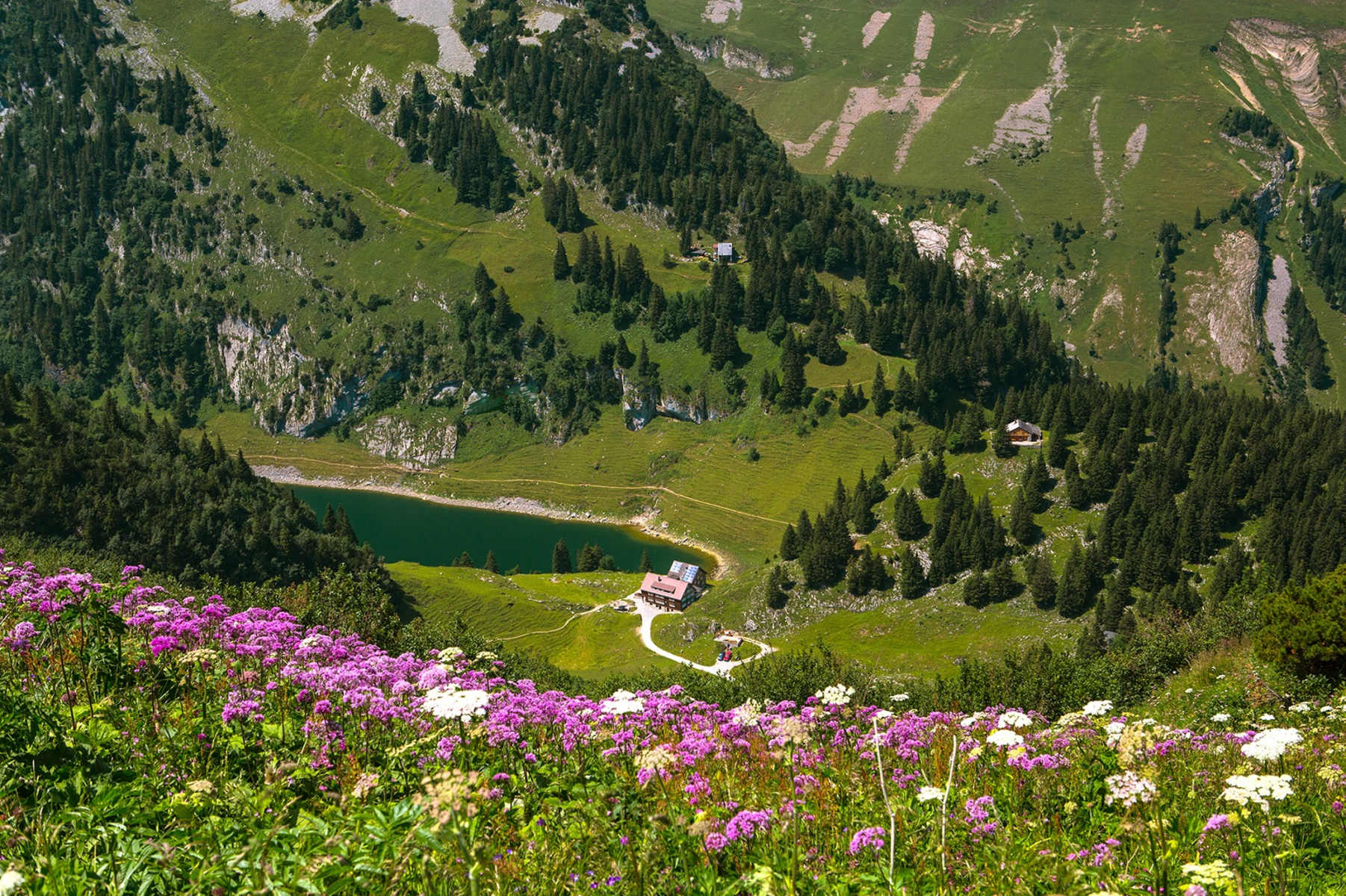 Beim Gasthaus wechselt man auf die andere Hangseite und spaziert entlang dem Furggelenfirst zur Saxer Lücke. Von hier erreicht man nach einem 45-minütigen, steilen Abstieg das Berggasthaus Bollenwees (1.471 m) am Ostufer des Fählensees.