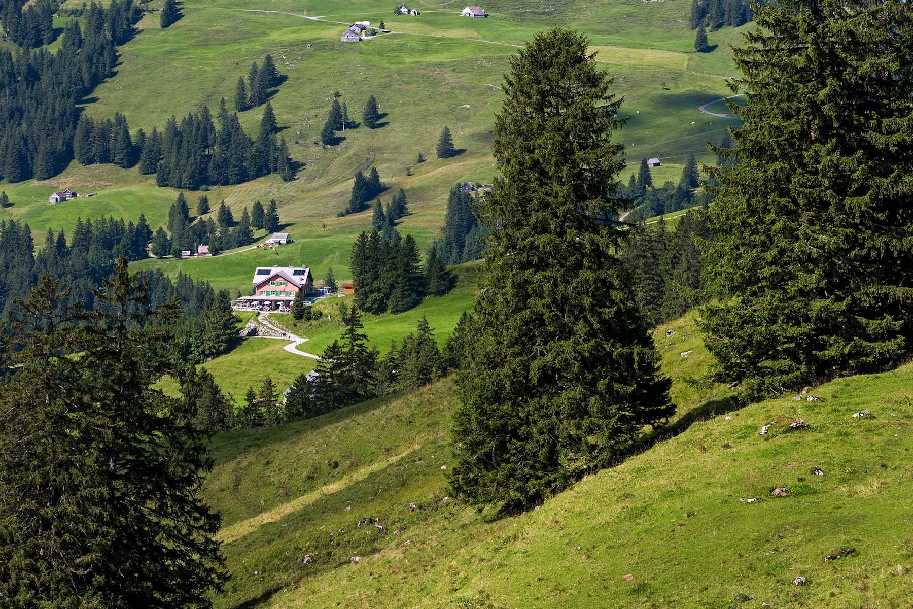 Vorbei am Berggasthaus Ruhesitz geht es weiter in Richtung Alp Soll. Hier nimmt die deutlich Steigung zu und der Weg schlängelt sich im Zickzack zum Höhenweg Hoher Kasten - Staubern, dem man bis zum Kastensattel folgt.