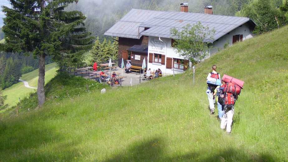 Beim nächsten Wegweiser hält man sich gerade aus und erreicht bald darauf die Älpelehütte auf 1.558 m. Hier folgt man der Straße nach links und erreicht leicht abwärts nach wenigen Minuten das Gerachhaus auf 1.550 m.