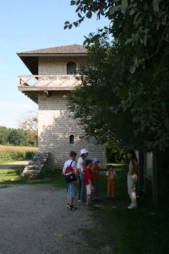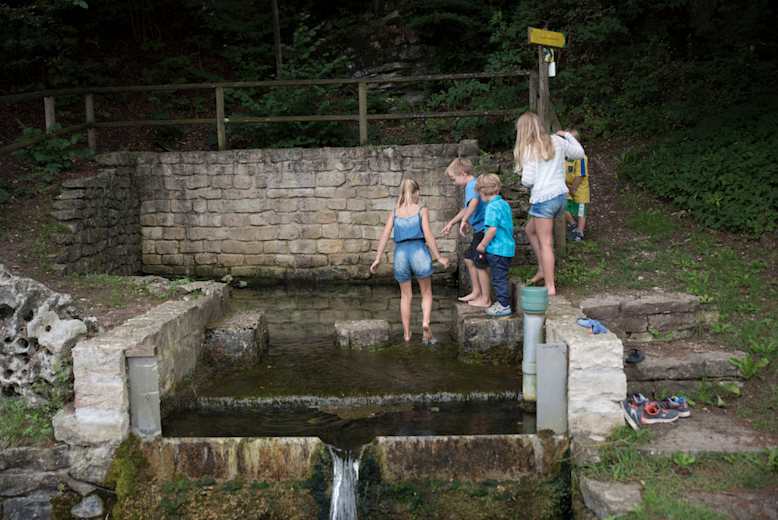 Man wandert an der Kirche vorbei zum Blaubrunnen. Von hier führt der Weg steil hinauf zur Burgruine Brunneck. An einer Wegkreuzung nach der Burg wandert man nach links und folgt nun immer der Ausschilderung durch den Wald bis man auf den Limeswall trifft. Wenig später kommt man zu einem Grundriss eines römischen Wachturms. Man wandert weiter zum Limesgedenkstein und auf einer Straße zum Römerturm vor Erkertshofen.