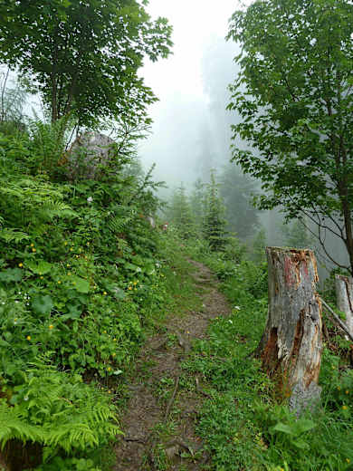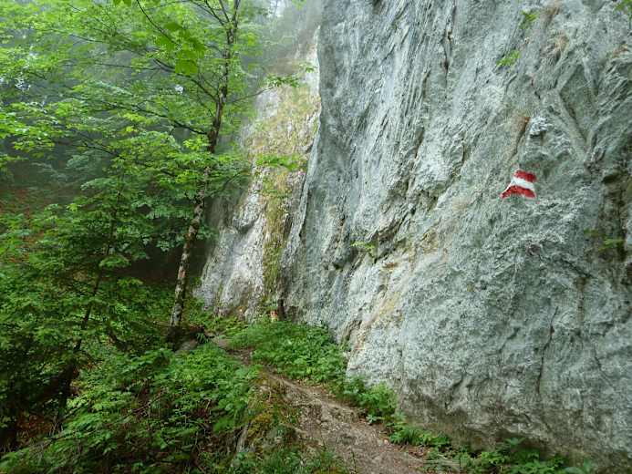 Nach wenigen Schritten weist der Wegweiser auf den Waldsteig rechter Hand hin, der in angenehmer Steigung durch den Bergwald aufwärts führt. Man unterquert die Seilbahn und wandert lange nach Osten. Die Wegverzweigungen sind gut beschildert. Man folgt immer der Richtung „Alpengasthof Karwendel" und „Zwölferkopf“.