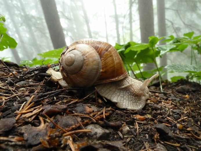 Am noch regennassen Morgen, sieht man dafür diese schönen Tiere: eine Weinbergschnecke. Foto: Christina Schwann, ökoalpin
