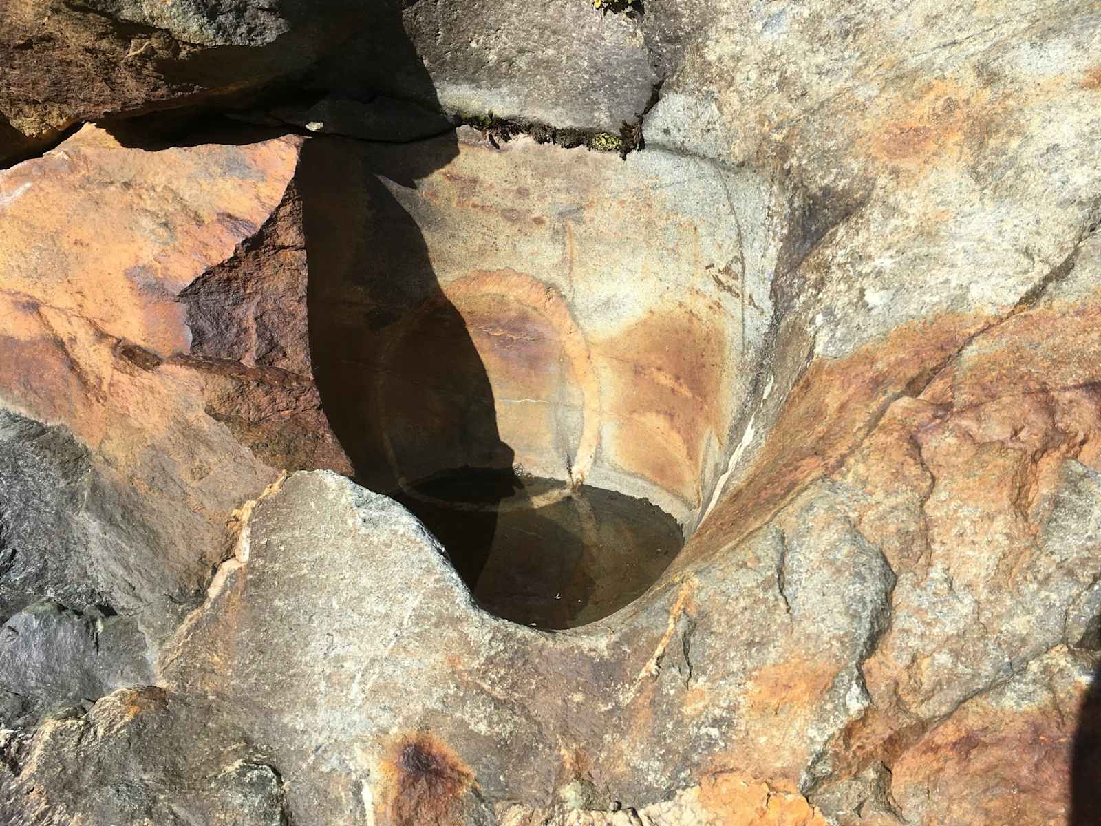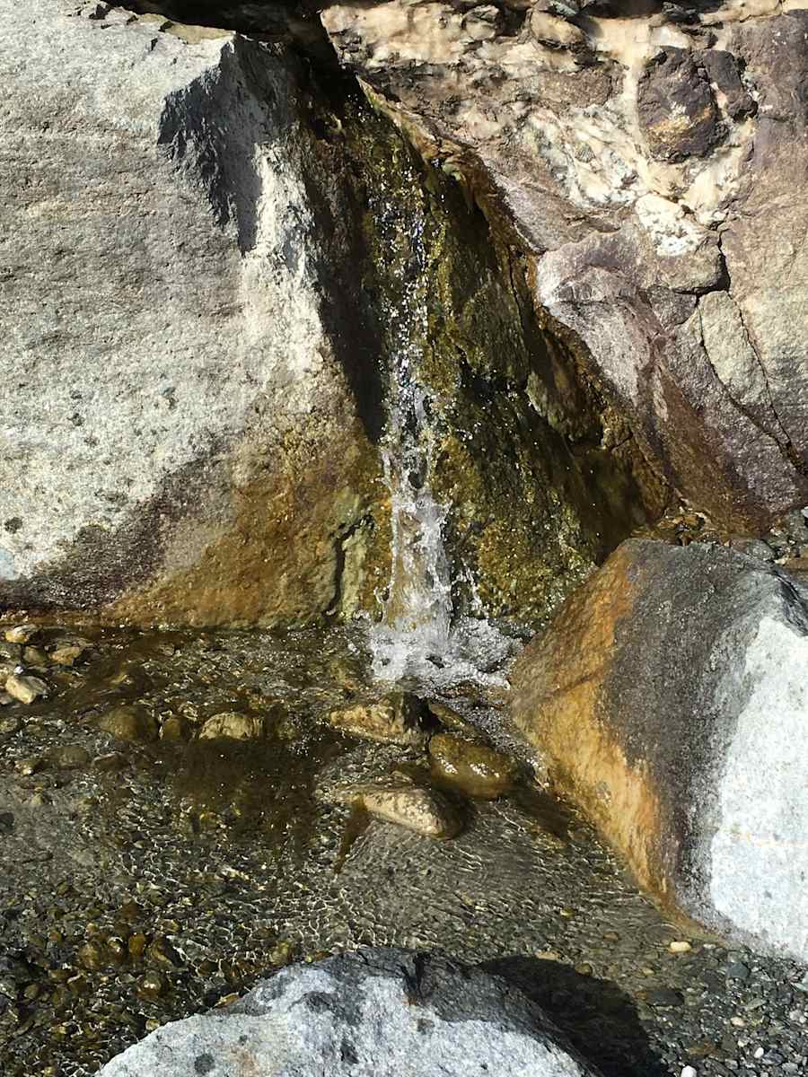 Weiter führt die Wanderung zu einer Felsquelle. Hier kann man besonders eindrücklich die Kraft des Wassers spüren. Damit ein Gletschertopf entsteht, braucht es eigentlich nicht mal einen Gletscher. Wasser, das mit hoher Geschwindigkeit und Druck fliesst, vermag bereits einen Topf zu bilden. Ein Gletscher und zusätzlich eine Gletschermühle erhöhen aber unter Umständen den Wasserdruck, was die erosiven Kräfte des Wassers verstärkt.