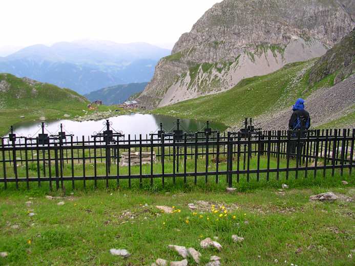 Hier hält man links in Richtung Sella dei Frugnoni, Weg Nr. 160, wo man auf 2.539 m die Grenze zu Österreich am Karnischen Hauptkamm überschreitet. Danach geht es gemütlich abwärts zur Obstandsereehütte am gleichnamigen See.
