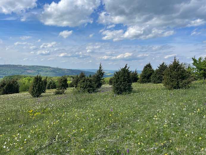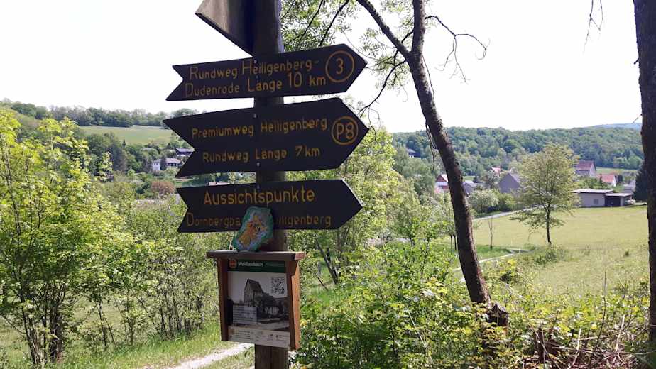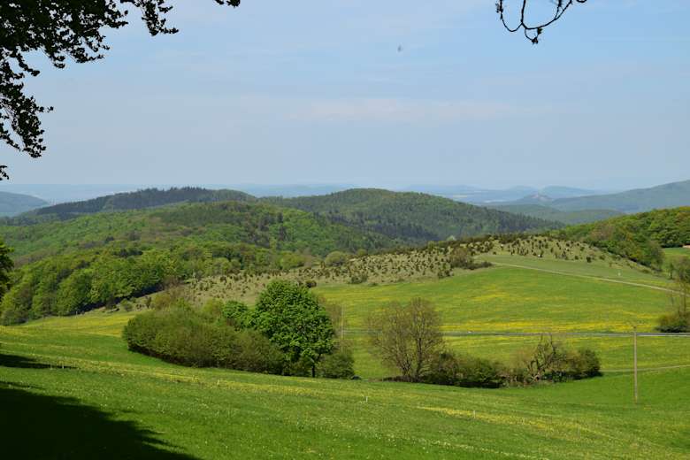 Der Weg führt über den Dornberg hinauf zum Heiligenberg. Hier bietet sich ein phantastischer Blick bis zum Hohen Meißner. Nun geht man hinunter zu einer Straße und wandert auf dieser nach links bis zum Wanderparkplatz am Naturschutzgebiet Bühlchen.