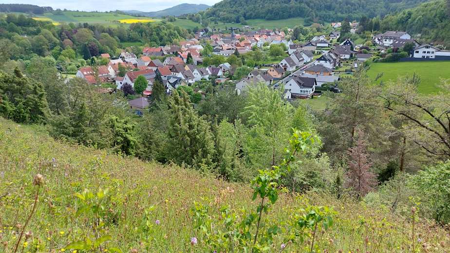 Man erreicht Ellingerode und steigt hinauf zum Hesselberg. Hier oben hat man einen schönen Blick zum Kaufunger Wald. Über Wiesen und Felder wandert man weiter und unternimmt den kurzen Abstecher zum Verlorenen Bach. Man kommt zu einer erfrischenden Wassertretstelle und wandert zurück zum Parkplatz.