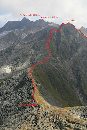 Geübte Bergsteiger steigen vom höchsten Punkt in gut 2 h zu den in der Gratlinie folgenden Piz Borel und Piz Ravetsch auf.