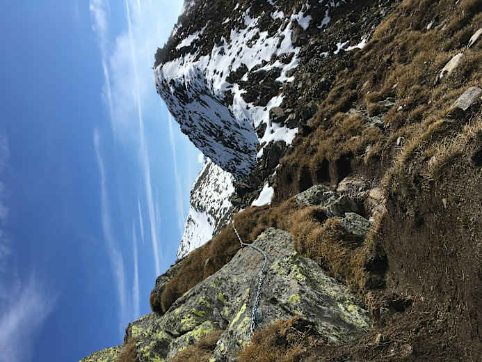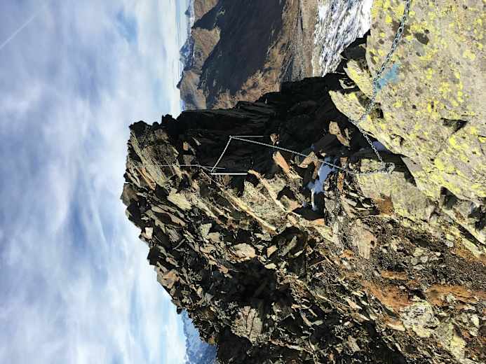 Auf dieser grossen Wasserscheide folgt man dem gut markierten neuen Gratweg bergauf. Interessant, erst über einen leichten Kamm, später über eine sanfte Kuppe, dann über dunkle Blockfelsen, führt der Alpinweg zunehmend steiler zu einem ersten Aussichtspunkt. Von links glitzert der Maighelsgletscher und rechts streift der Blick steil runter Richtung Airolo. Die Konzentration bleibt beim Weg, denn nun beginnt das mit Ketten und Eisenbügel gut gesicherte Teilstück.