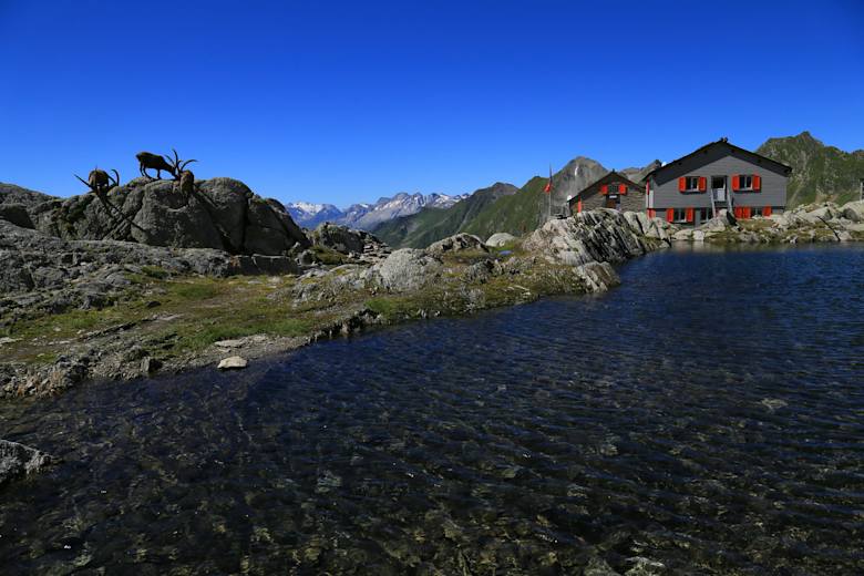 Der Weg bleibt attraktiv. Vorbei an Bergseen, kurzen Gratrücken, kargen Steinlandschaften begrüssen einen nach einer knappen Stunde die Steinböcke bei der Capanna Cadlimo. Wie schön ist ein kühles Bad und ein erfrischendes Bier im Liegestuhl auf der Sonnenterrasse.
