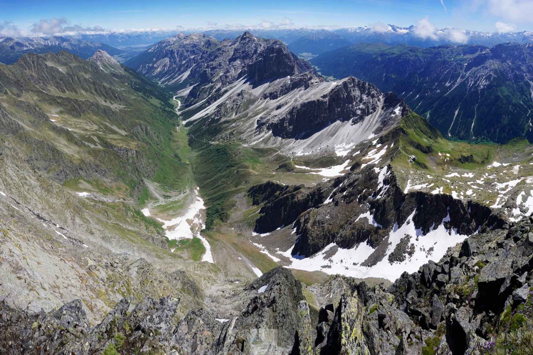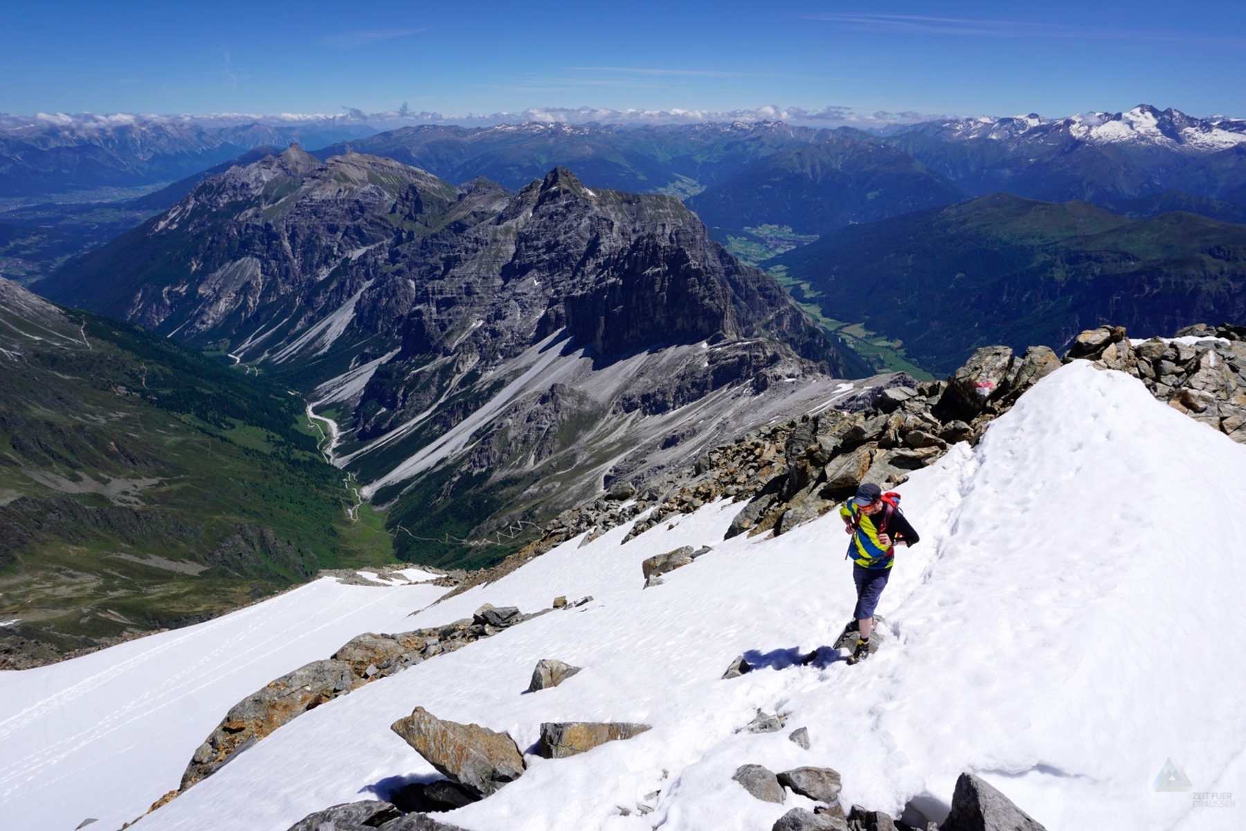 - Im Flachstück des Pinnistals, kurz nach Passieren der Issenanger Alm. Die felsige Kirchdachspitze (2.840 m) im hinteren Talbereich hebt sich kontrastreich von den Bergwiesen ab. In Kürze wird der Habicht sichtbar. - Foto: ZEIT FÜR DRAUSSEN.AT  - Im grünen Talschluss bei der Karalm (1.737 m). Bis hier ist die Auffahrt mit dem Taxidienst „Pinnis Shuttle“ möglich. Ein alternativer Zugang führt über den östlich unterhalb der Elferspitze verlaufenden Höhenweg vom Elferlift. - Foto: ZEIT FÜR DRAUSSEN.AT  - In der Auffahrt am „Bertlweg“ im Bereich der Alfairgrube. Der tiefste Gratpunkt ist das Pinnisjoch, rechts der Habicht. - Foto: ZEIT FÜR DRAUSSEN.AT  - Oberhalb der Alfairgrube zieht der Weg in vielen Kehren zum Pinnisjoch. - Foto: ZEIT FÜR DRAUSSEN.AT  - Kurz vor Erreichen des Pinnisjochs (2.369 m). Eine Auffahrt mit dem E-Bike bis hierher dauert etwa eine Stunde. Zu Fuß sind's drei. - Foto: ZEIT FÜR DRAUSSEN.AT  - Blick vom Pinnisjoch zur Innsbrucker Hütte. Wer hier nächtigt kann die gegenüberliegenden Tribulaune im Abendlicht bewundern und neben der Tour zum Habicht noch eine weitere in Erwägung ziehen. - Foto: ZEIT FÜR DRAUSSEN.AT  - Oberhalb der Innsbrucker Hütte verläuft der gut markierte Wanderweg in wenig schwierigem Gelände. Der Felsgipfel links im Bild ist die Kalkwand (2.564 m). - Foto: ZEIT FÜR DRAUSSEN.AT  - Oberhalb der ersten Steilstufe auf ca. 2.850 m Seehöhe. Der Anstieg hierher führt über teils schrofiges Gelände in dem Trittsicherheit essenziell ist. Stahlseile erleichtern die schwierigsten Passagen. Vorsicht bei Nässe oder Vereisung! - Foto: ZEIT FÜR DRAUSSEN.AT  - Tiefblick von der Schulter auf 2.900 m Seehöhe ins Pinnistal. Links der Elferkamm, rechts der Serleskamm, ganz rechts das Gschnitztal. - Foto: ZEIT FÜR DRAUSSEN.AT  - Früh in der Saison sind Teile des Anstiegs oberhalb von 3.000 m oft noch schneebedeckt. Es empfiehlt sich, am Rücken zu bleiben und den Markierungen zu folgen. - Foto: ZEIT FÜR DRAUSSEN.AT  - Auch im obersten Bereich des Anstiegs erleichtern Stahlseile die Fortbewegung. - Foto: ZEIT FÜR DRAUSSEN.AT  - Die letzten Meter sind felsig und steil. - Foto: ZEIT FÜR DRAUSSEN.AT  - Das Panorama vom Gipfel ist beeindruckend. Am Bild der Ausblick zum Stubaier Hauptkamm mit Wildem Freiger, Zuckerhütl & Co. - Foto: ZEIT FÜR DRAUSSEN.AT  - Retour auf der Innsbrucker Hütte entspannt man am besten auf der sonnigen Hüttenterrasse. Die freundlichen Wirtsleute geben gerne Tipps zu Speisen und umliegenden Touren. - Foto: ZEIT FÜR DRAUSSEN.AT  - Bereits 1.500 m tiefer. Unterhalb der schroffen Felswände der Kalkwand und der Ilmspitzen geht’s am „Bertlweg“ talwärts. - Foto: ZEIT FÜR DRAUSSEN.AT  - Die Abfahrt vom Pinnisjoch zur Karalm über den „Bertlweg“ ist erlebnisreich und schön. Die Wegbeschaffenheit ist gut, die technischen Schwierigkeiten, bis auf wenige enge Kehren, gering. - Foto: ZEIT FÜR DRAUSSEN.AT  - Einst hielt man den Habicht für einen der höchsten Berge Österreichs. Beim Anblick der Berges aus dem Pinnistal wird einem klar warum. - Foto: ZEIT FÜR DRAUSSEN.AT  - Knieschonend und flott gelangt man am Bike talwärts. Zur Einkehr empfehlen sich besonders die Karalm sowie die Issenangeralm. - Foto: ZEIT FÜR DRAUSSEN.AT - Bildergalerie (18)