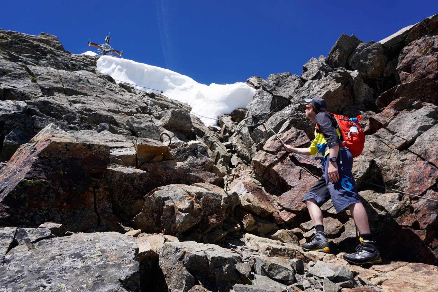 - Schlüsselstelle: der Gipfelbereich sowie ein felsiger Steilaufschwung zwischen 2.700 m und 2.850 m Seehöhe