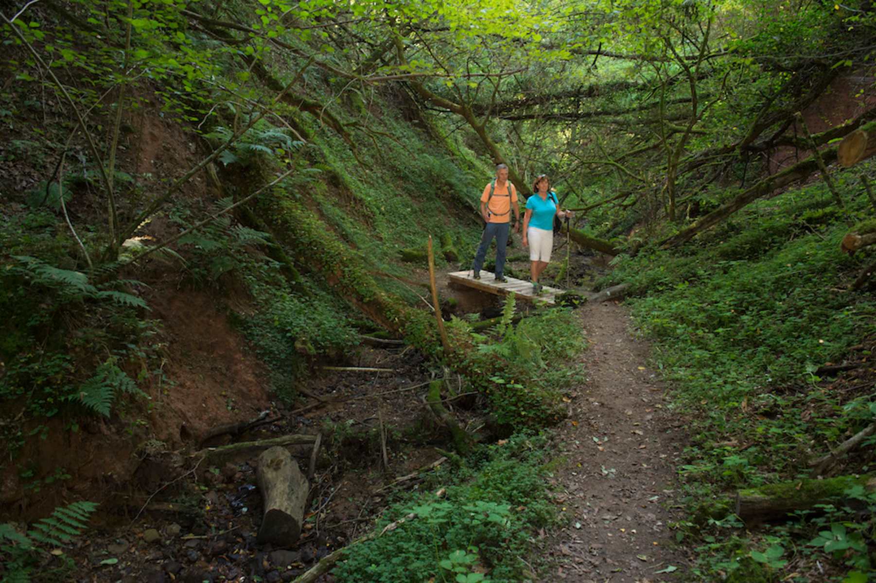 Weiter geht es, ganz gemütlich auf einem herrlich ebenen Wiesenweg am Hügelkamm entlang. Dazwischen einzelne Streuobstriesen und immer wieder atemberaubenden Rundum-Aussichten im 360° Radius. An einer Wegekreuzung geht es auf einem breiteren Weg bergab. Man geht weiter bergab durch einen Wald. Unten im Tal stößt man auf einen geschotterten Weg. Hier geht man nach rechts und biegt vor einer Straße in einen Wiesenpfad ein. Wenig später befindet man sich schon in der Oppig-Grät, deren Inneres an einen tropischen Regenwald erinnert. Wohin man auch blickt, überall seltene Schachtelhalme und eng verschlungene europäische Lianen.