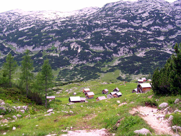 Schließlich erreicht man den Hochklapfsattel und wandert weiter in Richtung Nordosten. An der Wegverzweigung auf Höhe 1.345 hält man sich rechts und gelangt leicht ansteigend zu den Augstwiesenalmen, auf der mehrere alte Holzhütten stehen.