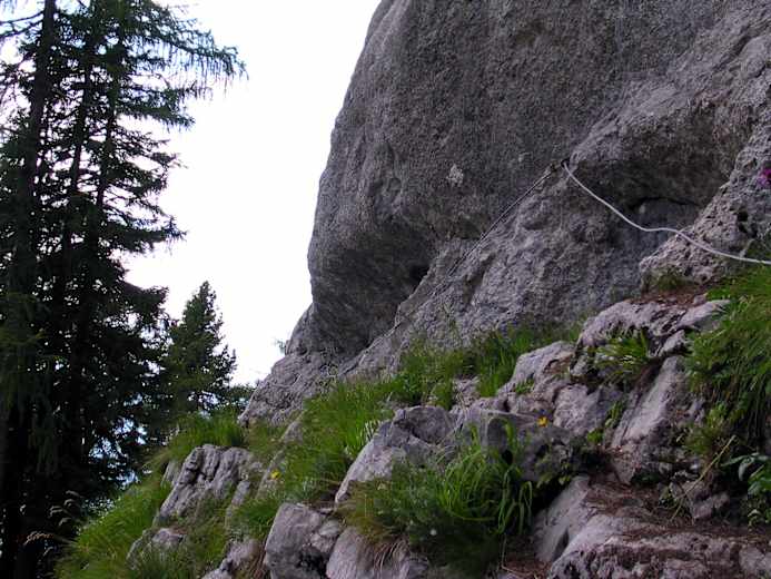 Hier hält man sich wieder rechts und wandert oberhalb der Eglgrube weiter. Noch einmal biegt man rechts ab und befindet sich somit auf der Via Alpina - Violetter Weg - und dem E4 alpin. Der Weg wird nun zunehmend schmäler und führt entlang des so genannten Karl-Stöger-Steiges seilversichert entlang der Felswand weiter. Bei einer Höhle spürt man die kühle Luft aus dem inneren des Berges nach außen dringen.