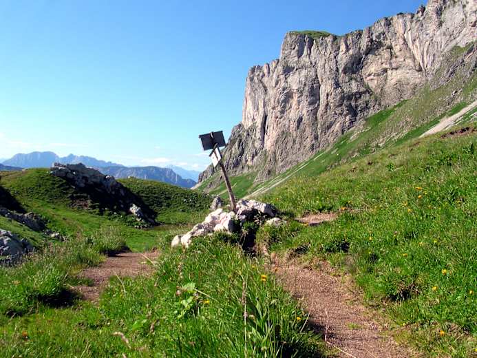 Kurz vor der Wiesenlacke befindet sich ein Wegweiser. Hier könnte man rechts über das Wildgößl, 2.062 m, wandern, oder man geht geradeaus weiter und nördlich des Wildgößls vorbei bis zum Abblasbühel, wo auch der Steig von Wildgößl herunter zieht.