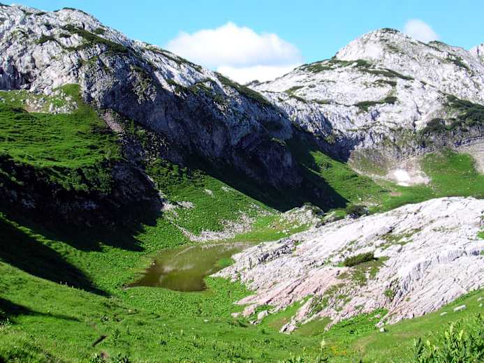 Der zweiten Tag im Toten Gebirge in der Steiermark führt vom Albert-Appel-Haus über das weite Karstplateau bis zur Pühringerhütte am idyllischen Elmsee auf 1.637 m. Der Weg ist leichter als am Vortag, es sind keine seilversicherten Stellen zu meistern.