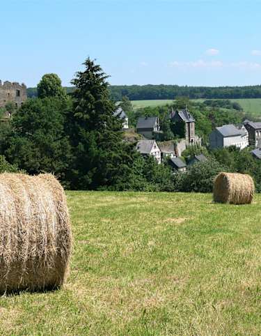 Von dort führt der Weg geradewegs in die Gemarkung Rüscheid mit dem neuen Lehrpfad "Dremherem em Reschd" (Drumherum um Rüscheid). Liebevoll erstellte Informationstafeln machen neugierig auf diesen Ort. Am höchsten Punkt überquert man die L 258 und freut sich an der Bürgermeister-Wink-Hütte über den wundervollen Ausblick ins gegenüberliegende Jahrsbachtal. Am Himmelsteich und am Sportplatz vorbei geht es über saftige Wiesen zu einer kleinen Aussichtskanzel. Hier bietet sich dem Wanderer bei guter Sicht nahezu ein Rundumblick, der im Osten bis zum Großen Feldberg im Taunus (70 km) reicht. Durch einen geheimnisvollen Wald führt der Weg zurück nach Anhausen. Letzter Höhepunkt ist die historisch eindrucksvolle Anhauser Kirche aus dem 13. Jahrhundert.