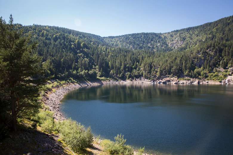 Vom Parkplatz am Lac Blanc wandert man auf dem einfachen Wanderweg am Observatoire Belmont vorbei zum kleineren Lac Noir. Die beiden Seen bilden ein Pumpspeicherkraftwerk.
