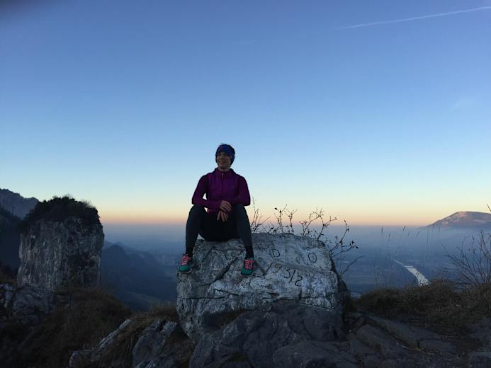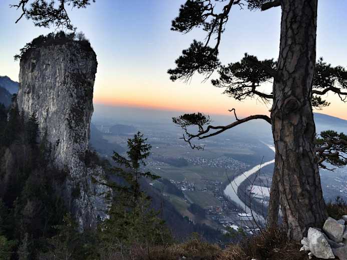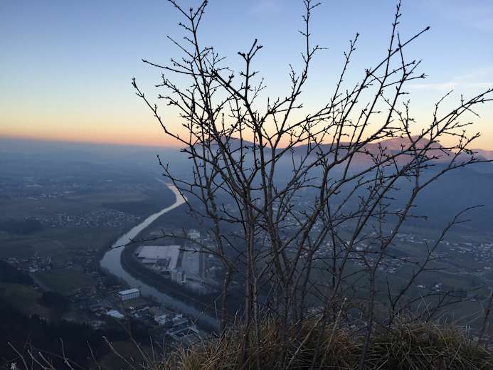 Eine längere Gerade quert flach bis kurz unter den Gipfel, den man über eine gut gestufte Felsrinne erreicht. Eine Holzbank lädt zum Ausruhen und Verweilen ein während man ausgiebig die Aussicht auf die Stadt und die umliegenden Gipfel genießt.