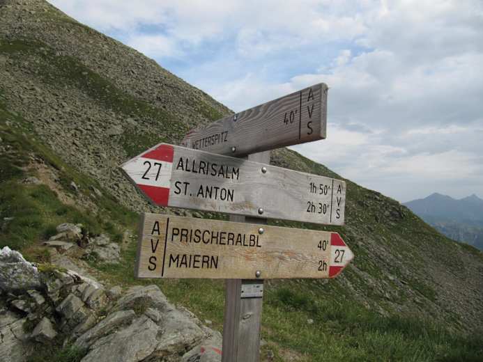 Auf dem Weg Nr. 27, der auch einige Abkürzungen zulässt, wandert man im Alrißtal auf dem Tiroler Höhenweg zur Alrißalm (Einkehrmöglichkeit). Mn benötigt dazu ungefähr 1 Stunde, im Blick habt man die vor sich stehende Wetterspitze.