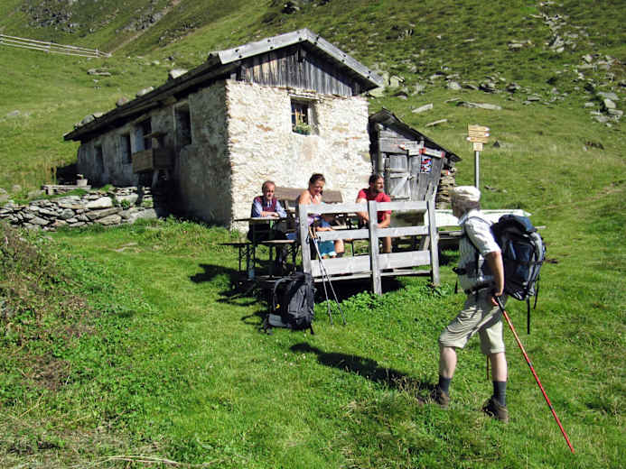 Nach einer ausgiebigen Rast erfolgt der Abstieg auf Steig Nr. 27, vorbei an der urigen Prischeralm (Einkehrmöglichkeit) über Bergmähder und den steilen Schutzwald nach Maiern im Ridnauntal auf 1.370 m.