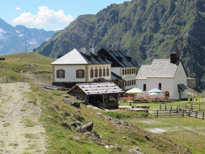 Vor einem gut sichtbar liegt die Schutzhütte Schneeberg, die man in 1 Std. erreicht. Bei der Schutzhütte Schneeberg handelt es sich um keine Almhütte im herkömmlichen Sinn, sondern um ein stattliches Gasthaus. Die Schutzhütte liegt auf 2.355 m in geschichtsträchtiger Umgebung neben dem Knappenkirchlein Maria Schnee. Sie lädt mit den holzvertäfelten Stuben und mit einer geräumigen Terrasse zum Verweilen, Genießen und Übernachten ein. Der beeindruckende Rundblick schweift von den schroff abfallenden Wänden der Gürtelspitze über das helle Kalkband der Schneeberger Weißen bis hin zum Kaindljoch.