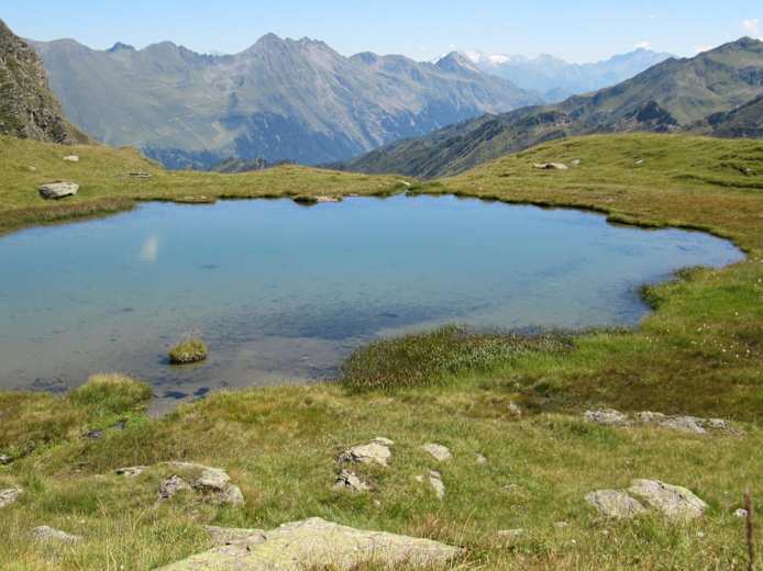 Taleinwärts rechts haltend ab der Moarerbergalm folgt man dem Steig Nr. 28, kommt an einem idyllischen Bergsee vorbei und überwindet die letzten Höhenmeter über zahlreiche Serpentinen, bis endlich der höchste Übergang, die Schneebergscharte mit knapp 2.700 m, erreicht ist. Eine herrliche Rundumsicht belohnt den langen Aufstieg.