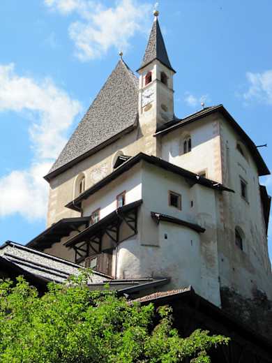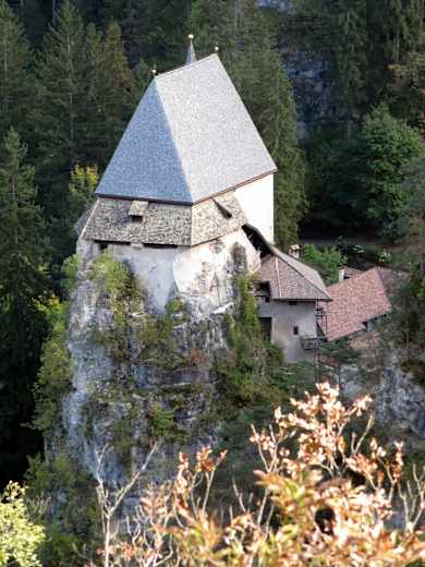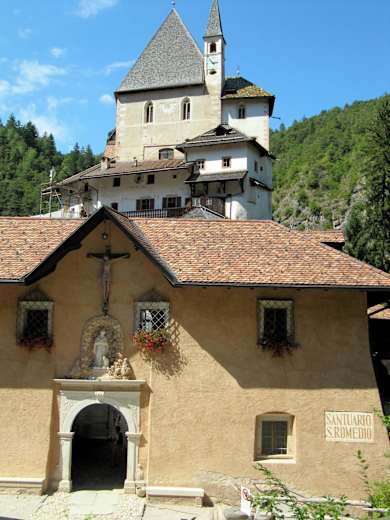 Auf diesem Weg wandert man steil hinunter ins Nonstal. Man trifft auf die Straße, hier links abbiegen und der Beschilderung bis zur Kirche S. Romedio folgen. Das Ziel der Fußwallfahrt ist erreicht.