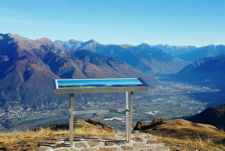 Nachdem man einen Blick auf die bekannte Kirche Santa Maria degli Angeli geworfen hat, führt der Weiterweg, stets dem Bergrücken folgend, über La Manera vorbei an der Campanna Tamaro (1.878 m) zum Gipfel des Monte Tamaro auf 1.962 m, der eine wunderbare Aussicht auf die umliegenden Gipfel der Tessiner Alpen bietet.