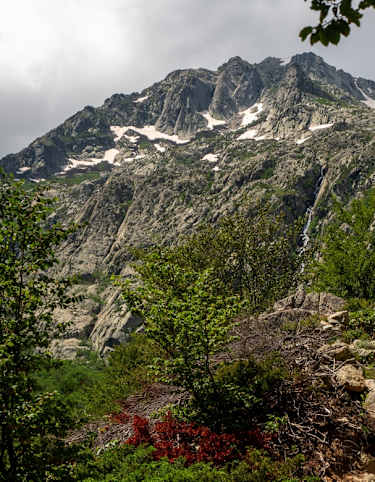 Zunächst steil aber nicht anspruchsvoll vom Refuge d’Asinau hoch bis zur Bocca Stazzurna, dann der gelben Variante und nicht dem GR20 nach rechts bzw. Nordosten folgen. Nach dem Gipfel des 2.130 Meter hohen Monte Inudine langer, flacher und aussichtsreicher Abstieg bis zum Casamintellu-Bach. Von dort weiter bis zum Refuge Matalza (Achtung, Weg nicht ganz einfach zu finden), ab da wieder weiter auf dem GR20. Von der Bergeries de Basetta schöner Anstieg durch den Wald bis zum Beginn des Denkmalsgrat, der am Ende mit einer einstündigen, alpinen Wegstrecke wartet, die bei Nässe herausfordernd werden kann.