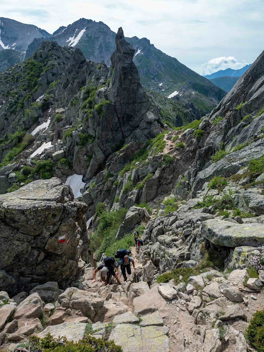 Die Etappe ist einer der Highlights am GR20. Vom Refuge de Petra Piana geht es zunächst rund 400 Höhenmeter bergauf bis zur Bocca Muzella. Von dort aus ein Auf und Ab durch hochalpines Gelände mit einigen Kletterstellen bis zur Breche de Capitello. Die Ausblicke sind fantastisch. Leider ist hier auch immer sehr viel Verkehr, vor und bei Schlüsselstellen bilden sich regelrechte Ameisenstraßen.
