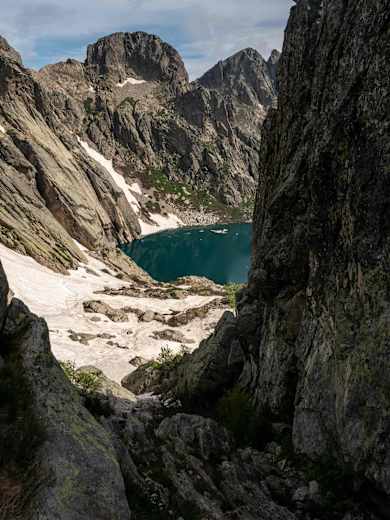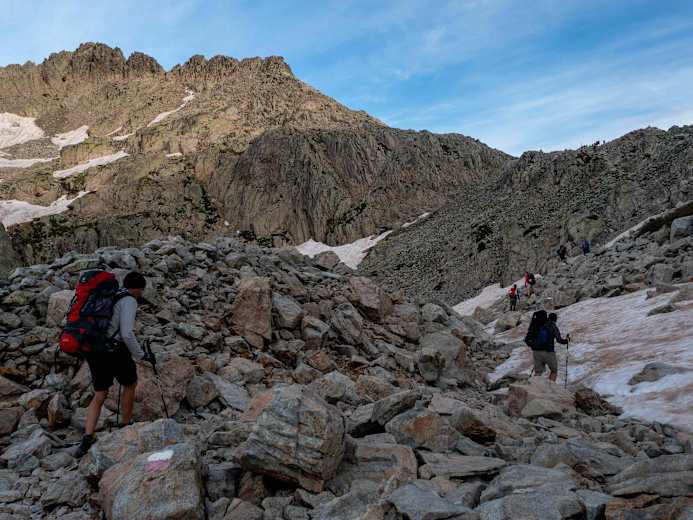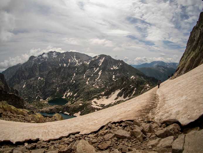 Mitte/Ende Juni 2018 waren auf der Etappe noch einige Schneefelder zu queren, die, wenn eisig und wenn man keine Steigeisen bzw. Grödel mithat, eine Herausforderung sein können. Speziell das Schneefeld kurz vor dem Beginn des Abstiegs zum Refuge de Manganu hatte es in sich - hier ist Abrutschen verboten, es würde sonst eine 150 Höhenmeter lange Schlittenfahrt hinunter zum See folgen. Der Abstieg ist steil und zäh, ebenfalls mit ein paar Kletterstellen gespickt.